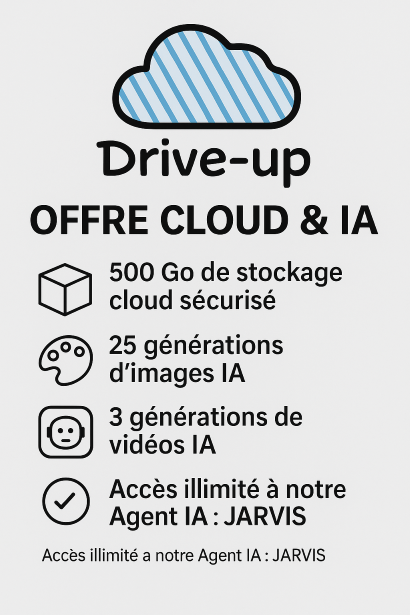 500Go de stockage cloud + 25 Générations d’images IA via l’interface JARVIS et 3 générations vidéo IA via l’interface JARVIS
